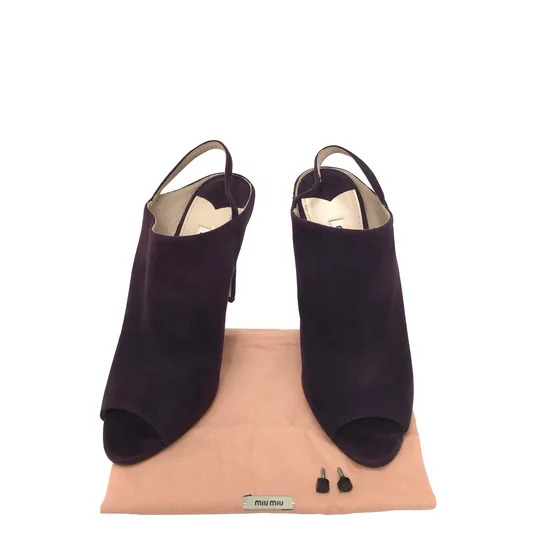 Sapato Miu Miu confeccionado em camurça na cor roxa. O modelo todo fechado no peito do pé, possui abertura na parte frontal e tira slingback com elástico.