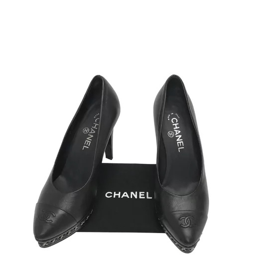 Scarpin Chanel Chain Couro Preto chanel Moda plus size original brechó desapego desapego de luxo segunda mão second hand usado usado e bom estado conservado bolsas usadas bolsas segunda mao etiqueta unica enjoei peguei bode bolsas conservadas