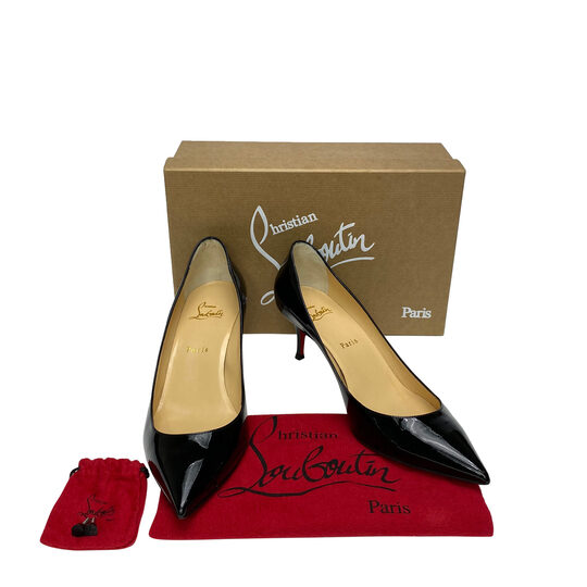 Scarpin Christian Louboutin Pigalle Follies 55. Confeccionado em verniz preto, o modelo possui bico fino alongado e salto fino baixo.