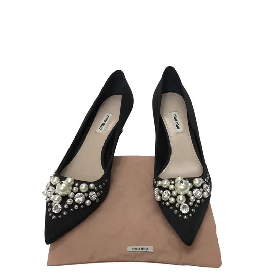 Scarpin Miu Miu confeccionado em cetim preto. O modelo de bico fino e salto baixo, traz como destaque a aplicação de pérolas e cristais na parte frontal.